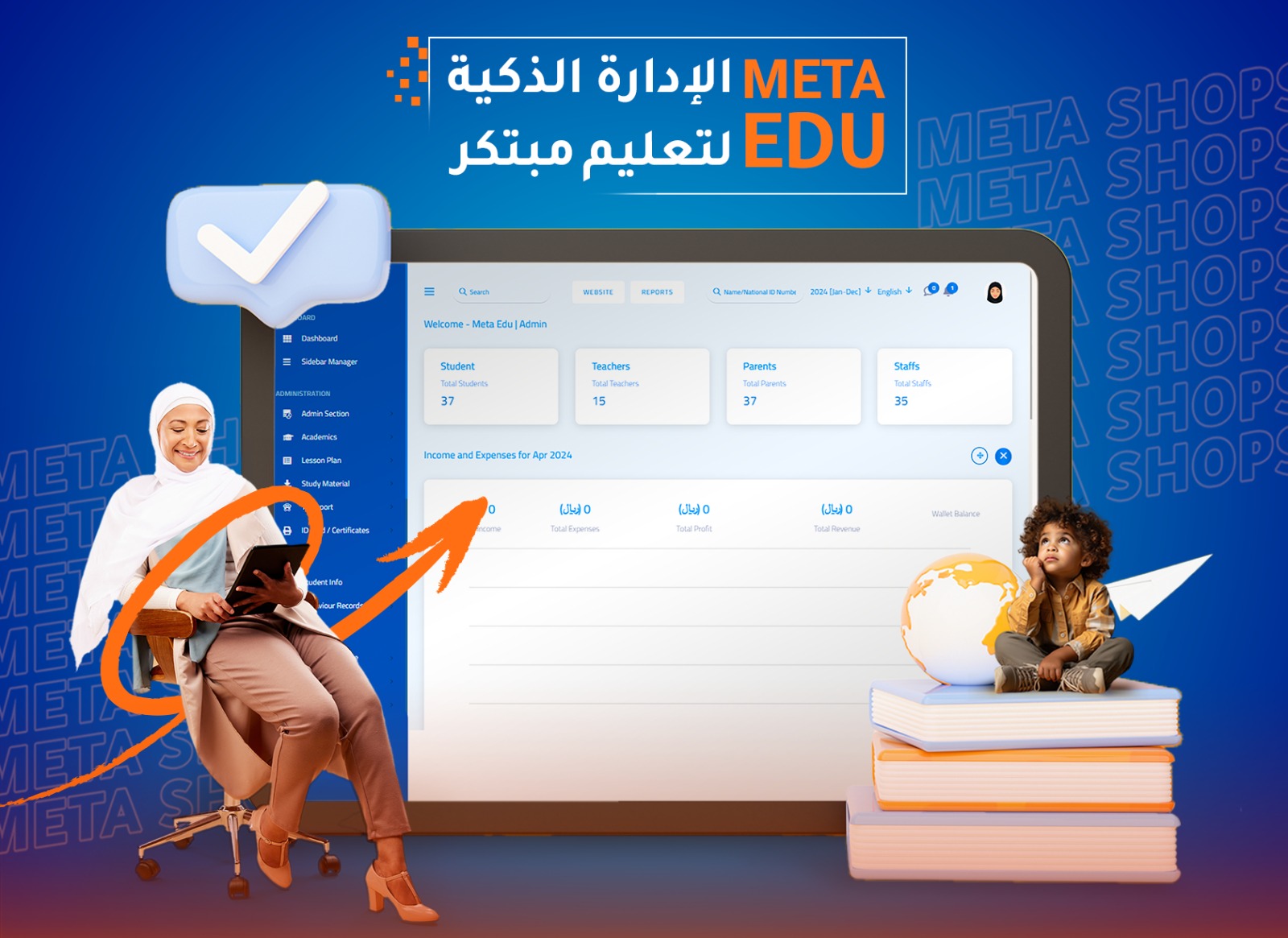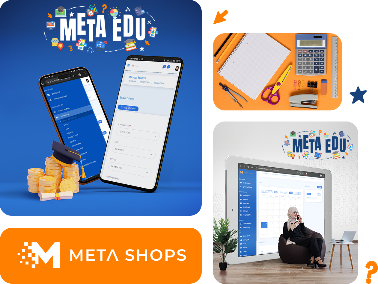 في Meta Shops نفتخر بتقديم نظام تعليمي إداري محاسبي متكامل يضم ميزات مبتكرة. يُعد نظامنا الفريد مرنًا وسهل الاستخدام، ويتمتع بلوحة تحكم عربية كاملة ودعم فني باللغة العربية يوفر المساعدة في أي وقت.